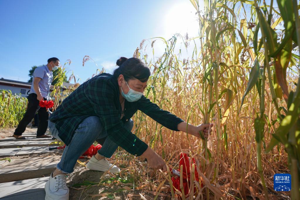 9月24日,秋收活動參與者用鐮刀收割北京先農壇“明清耤田”里的黍。