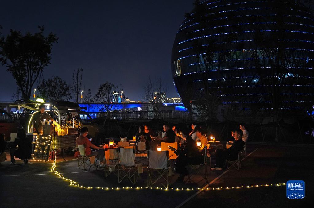 在南昌市紅谷灘區的一處空地,客人們在“7月末移動小攤”聊天休閑(9月22日攝)。