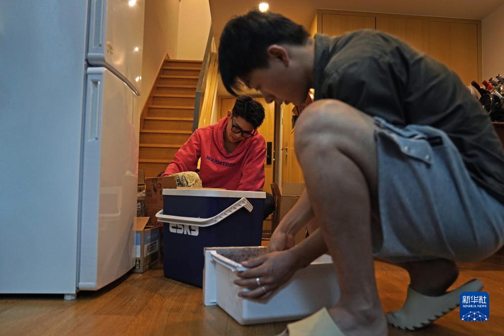 在南昌市紅谷灘區的一處青年公寓里,呂琦飛(前)與張子聰在準備出攤用的冰塊(9月22日攝)。