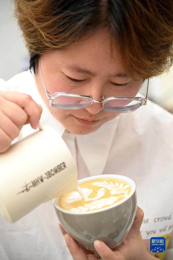 9月24日,聽障咖啡師陳佳悅在自己經營的咖啡館里為顧客制作咖啡。