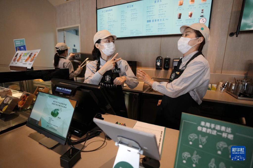 7月4日,在星巴克西安翠華里手語店,“無聲咖啡師”公益培訓項目學員、聽障咖啡師王茹(右)和聽障咖啡師李莎通過手語交流。