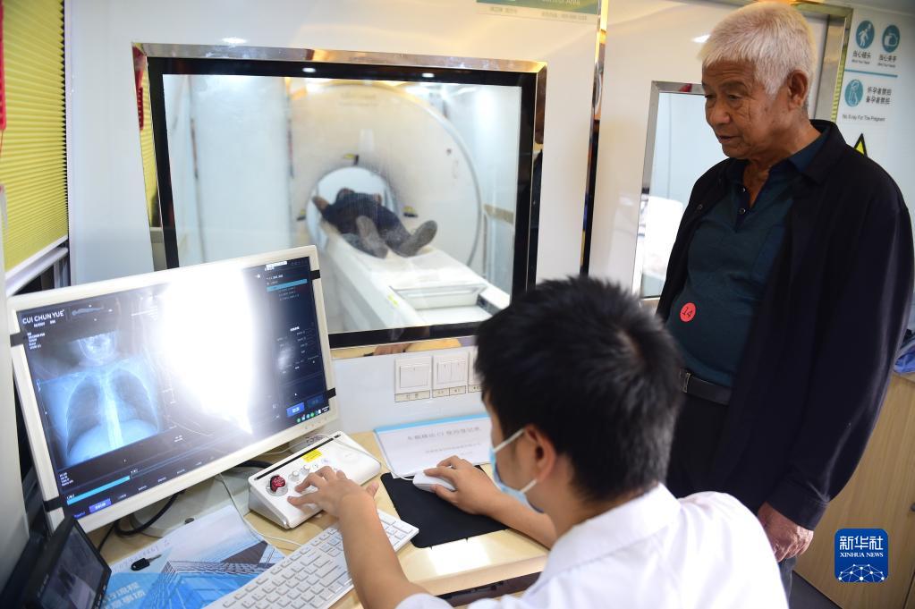9月25日,滄州中西醫結合醫院放化療中心醫生在“移動CT”室內為群眾進行肺部影像檢查。