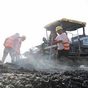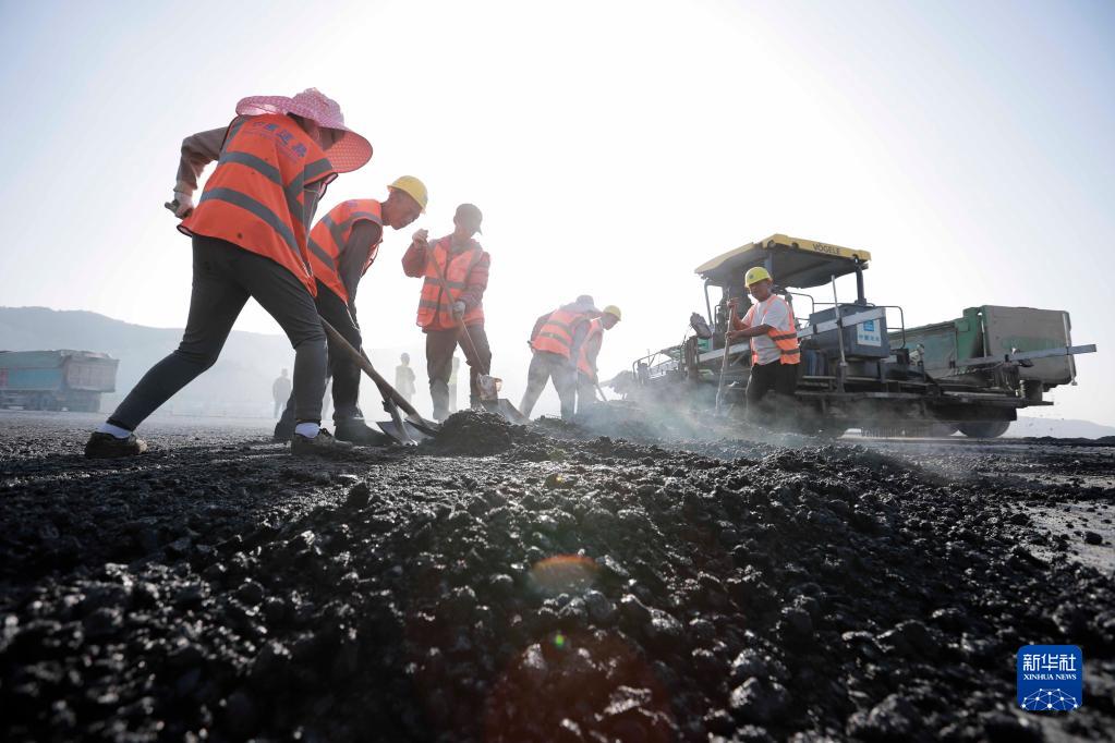 9月25日,工人在京秦高速遵秦段河北省遵化市境內進行路面施工。