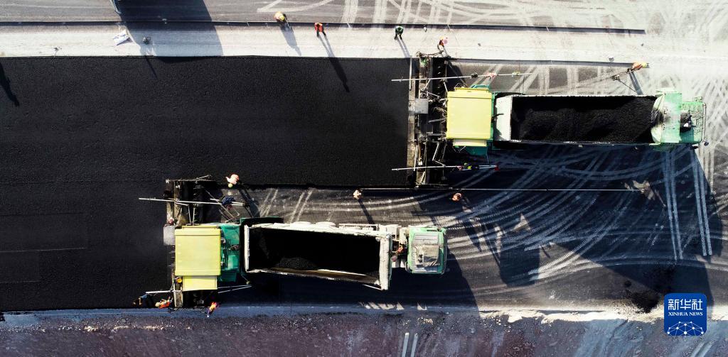 9月25日,工人在京秦高速遵秦段河北省遵化市境內進行路面施工(無人機照片)。