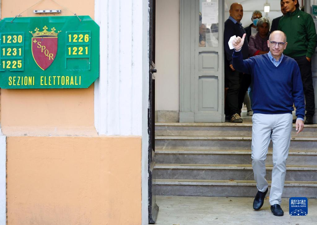 9月25日,意大利前總理、民主黨領導人萊塔投票后走出羅馬一處投票站。