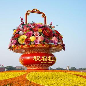 國慶節臨近,“祝福祖國”巨型花果籃亮相北京天安門廣場。今年“祝福祖國”巨型花果籃頂高18米,以喜慶的花果籃為主景,花壇底部直徑48米。