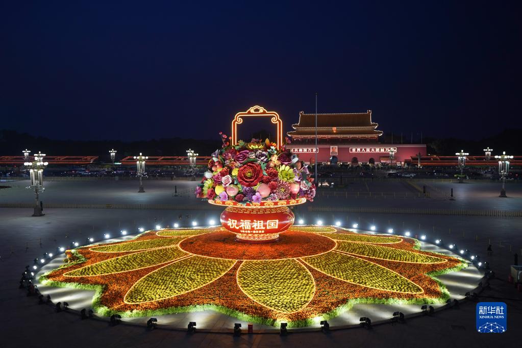 國慶節臨近,“祝福祖國”巨型花果籃亮相北京天安門廣場。今年“祝福祖國”巨型花果籃頂高18米,以喜慶的花果籃為主景,花壇底部直徑48米。