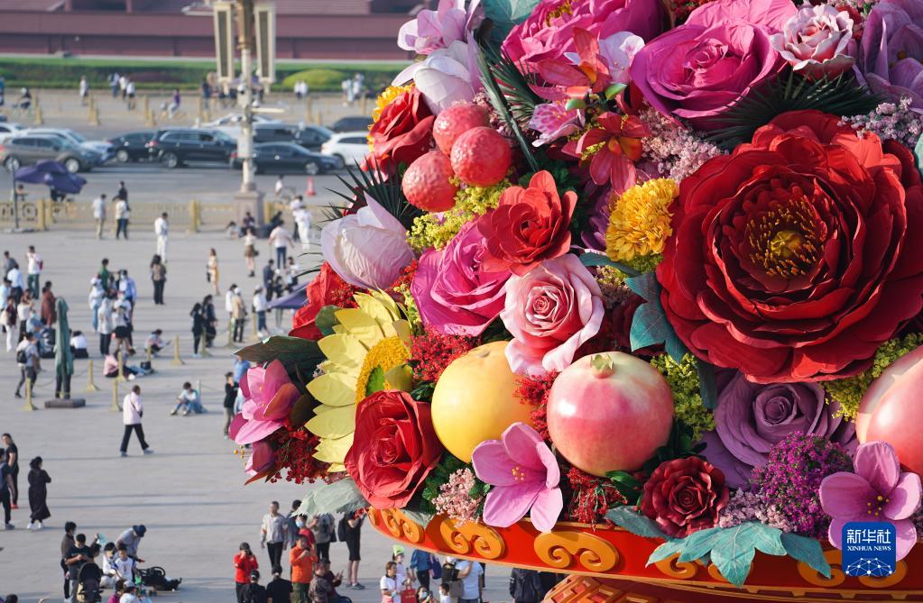 國慶節臨近,“祝福祖國”巨型花果籃亮相北京天安門廣場。今年“祝福祖國”巨型花果籃頂高18米,以喜慶的花果籃為主景,花壇底部直徑48米。