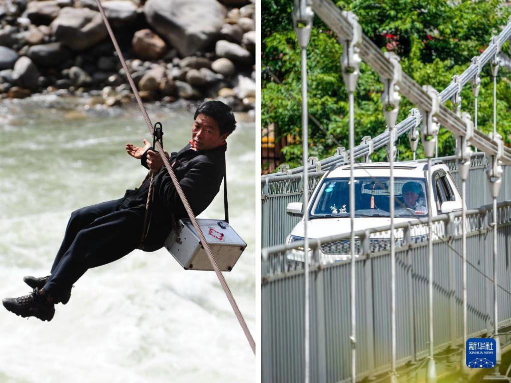 這是一張拼版照片:左圖為2011年2月20日,“溜索醫生”鄧前堆在怒江州福貢縣石月亮鄉拉馬底村溜索到江對岸出診(新華社記者秦晴攝)。右圖為2022年9月14日,鄧前堆出診歸來駕駛私家車過橋(新華社記者江文耀攝)。新華社發