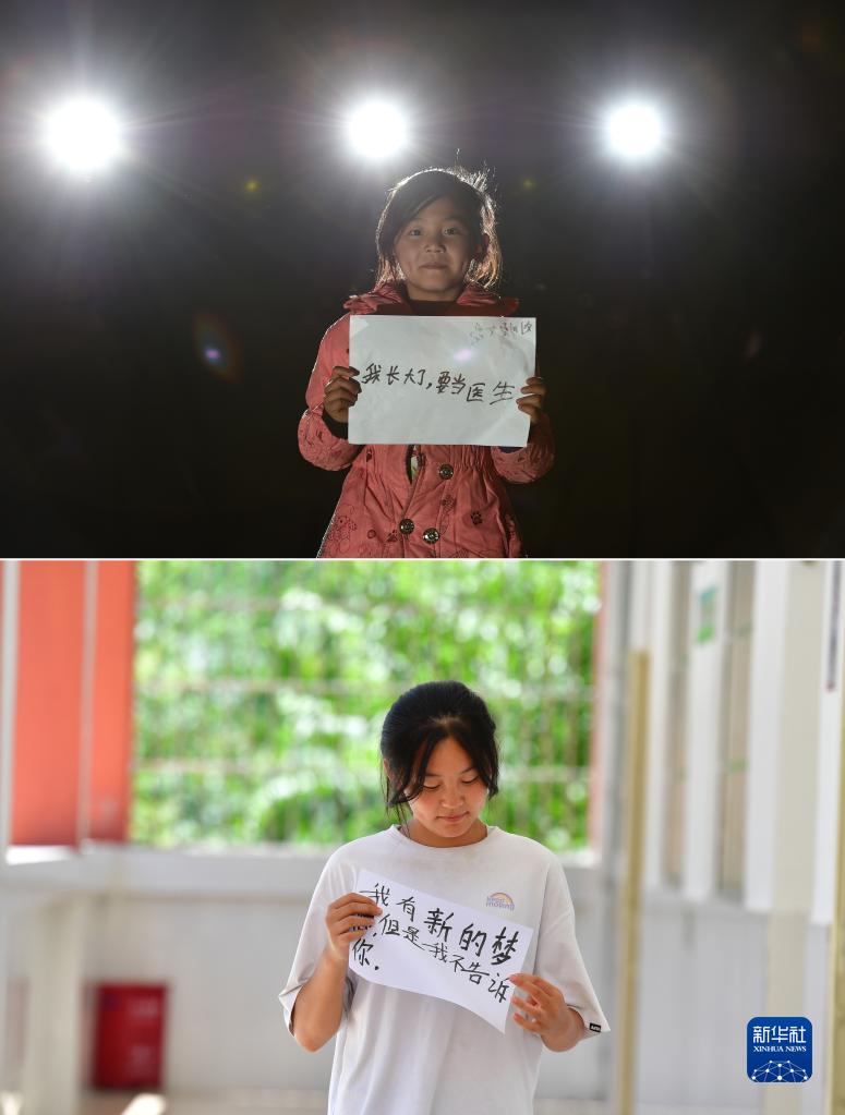 上圖:在廣西大化瑤族自治縣板升鄉弄勇小學,9歲的劉順媛展示自己的夢想(2015年1月28日攝);下圖:已經到縣城讀高中的劉順媛,有了新的夢想(2022年7月26日攝)(拼版照片)。