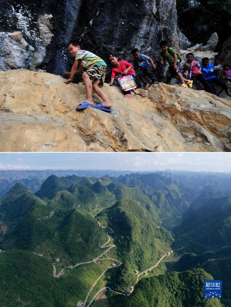 上圖:在廣西大化瑤族自治縣板升鄉弄雷村哈保屯,孩子們放學后爬懸崖回家(2012年9月5日攝);下圖:如今的弄雷村已實現屯屯通公路(2022年8月23日攝)。當年爬懸崖求學的孩子們,有些已經考上大學,有些還在讀高中,有的讀中專(拼版照片)。