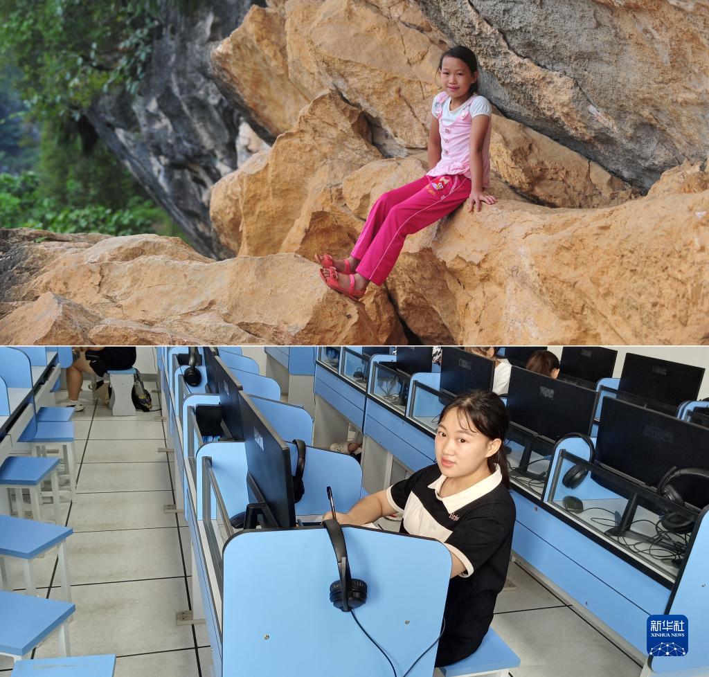 上圖:在廣西大化瑤族自治縣板升鄉弄雷村哈保屯,11歲的蒙秋艷在懸崖邊休息,這一處約300米長的半山懸崖,是她讀小學期間每天都要走的路(2012年9月5日新華社記者黃孝邦攝);下圖:已經實現大學夢想的蒙秋艷,就讀于廣西醫科大學,這是她在學校的語音室學習(新華社發,2022年9月5日韋婷婷攝)(拼版照片)。