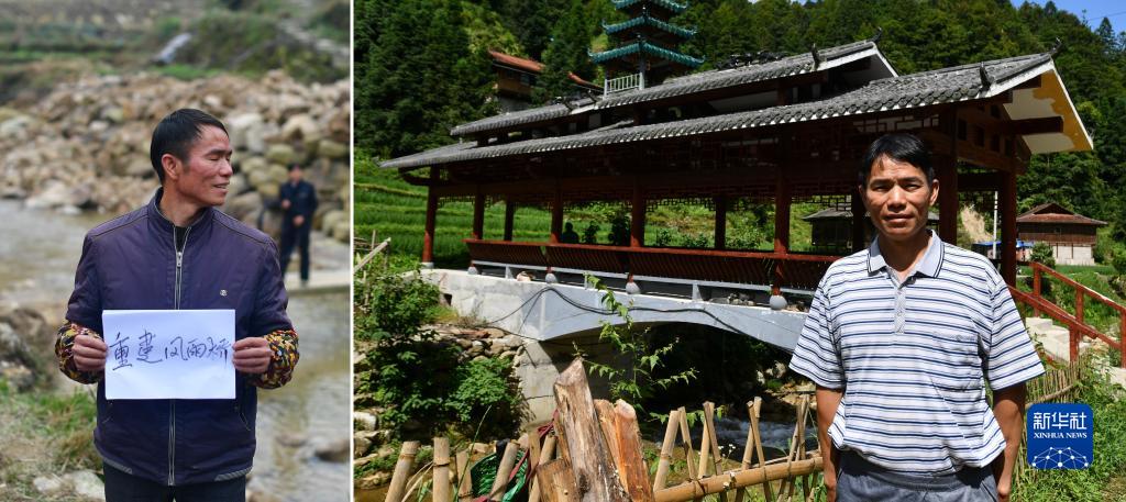 左圖:廣西融水苗族自治縣桿洞鄉烏英苗寨村民梁秀平展示村民們“重建風雨橋”的夢想(2018年12月24日攝);右圖:梁秀平站在新建成的風雨橋前(2022年7月24日攝)。2017年夏天,烏英苗寨老風雨橋被洪水沖垮,嚴重影響村民的生產生活。2021年,在對口幫扶的西北工業大學的捐助下,烏英苗寨重建了風雨橋(拼版照片)。
