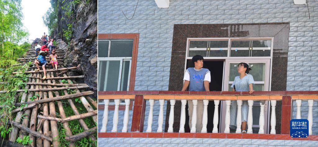 左圖:在廣西大化瑤族自治縣板升鄉弄勇村弄頂屯,弄勇小學三年級學生藍春香(前右)爬“天梯”去上學(2012年9月3日攝);右圖:即將上大學的藍春香(右)向學長蒙宣任了解大學生活(2022年8月23日攝)。目前,弄勇村已經屯屯通公路(拼版照片)。