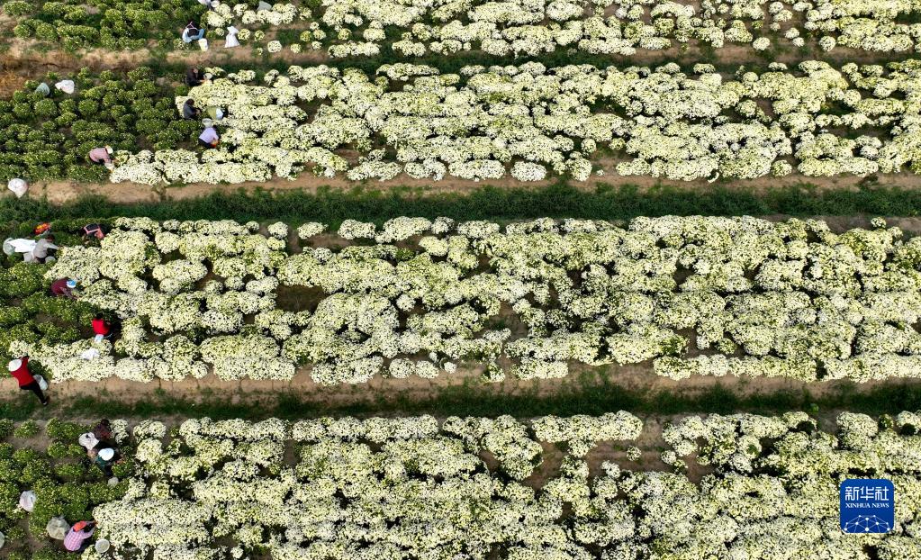 9月26日,在安徽省亳州市譙城區十八里鎮蔣李村菊花種植基地,菊農在田間采收菊花(無人機照片)。