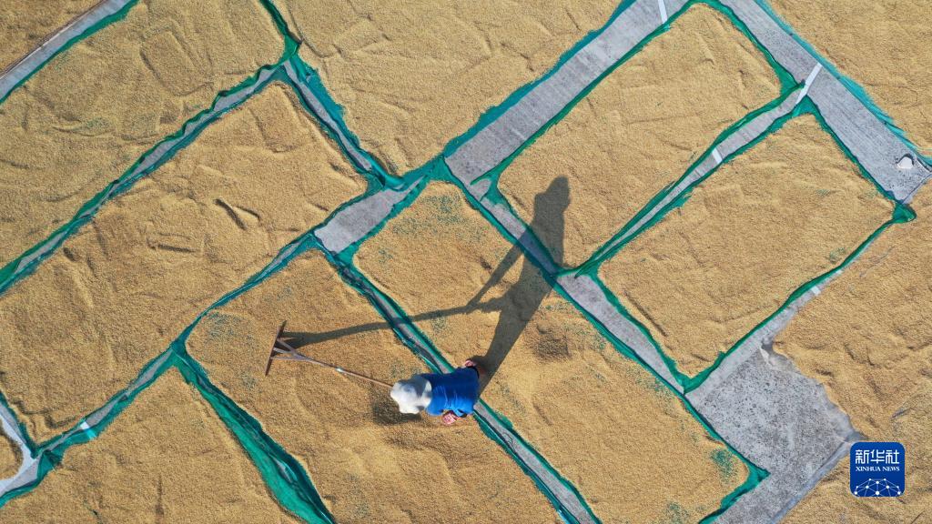 9月26日,貴州省黔東南苗族侗族自治州劍河縣革東鎮光條村村民在晾曬稻谷(無人機照片)。