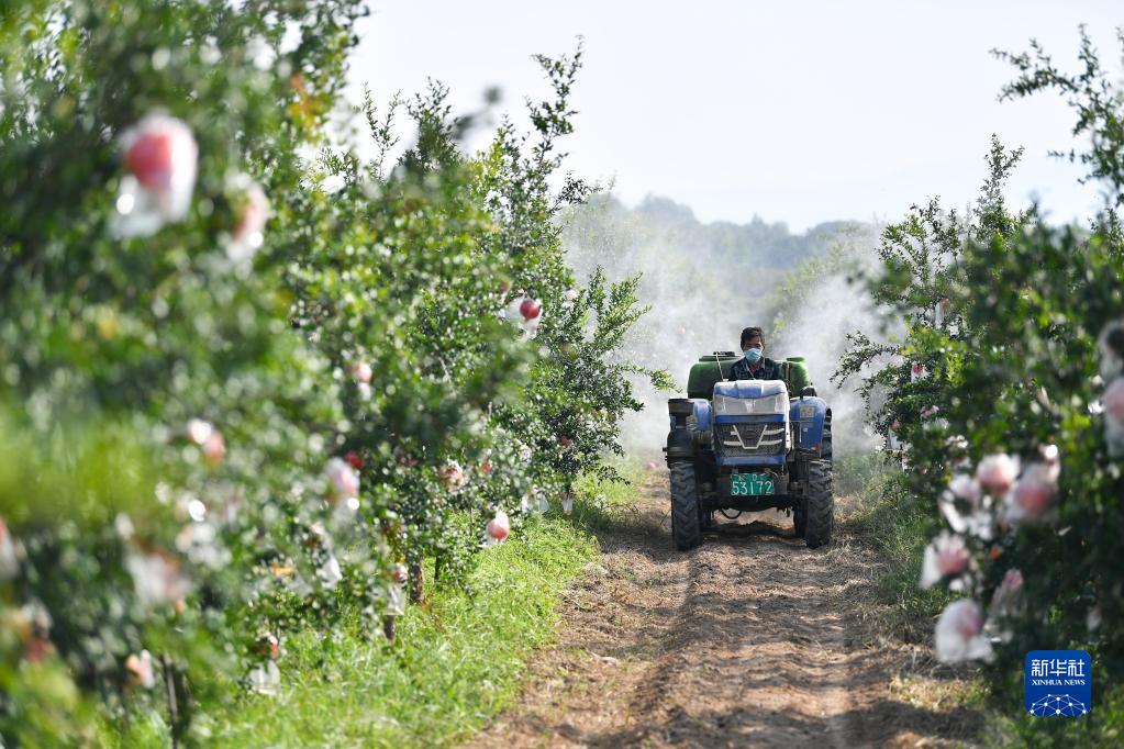 9月26日,工作人員在位于西安市臨潼區的石榴紅生態科技園駕駛農機對石榴噴灑酵素肥料。