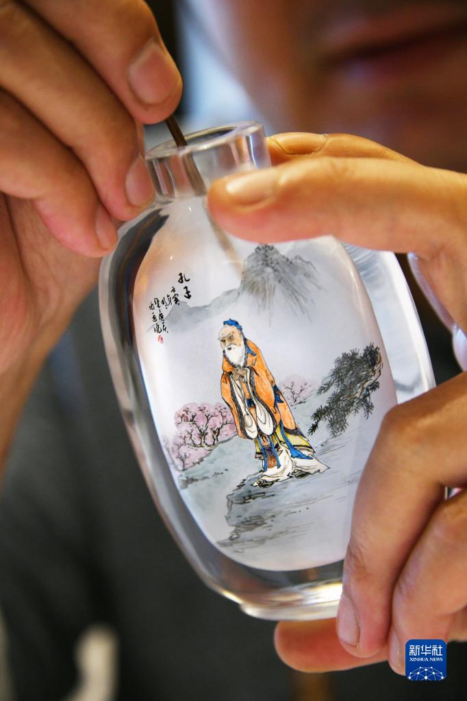 9月26日,魯派內畫非遺傳承人張路華在鼻煙壺內畫孔子像。