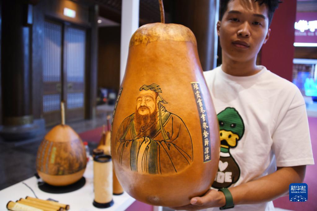 9月26日,葫蘆烙畫非遺傳承人賈飛展示他創作的葫蘆烙畫孔子像。