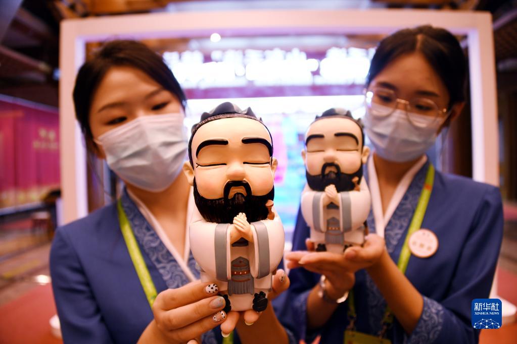 9月26日,兩名會務志愿者在展示文創孔子像。