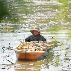 9月27日,在長沙市望城區靖港鎮蘆江社區一處藕塘內,藕農準備把收獲的蓮藕運往岸邊。
