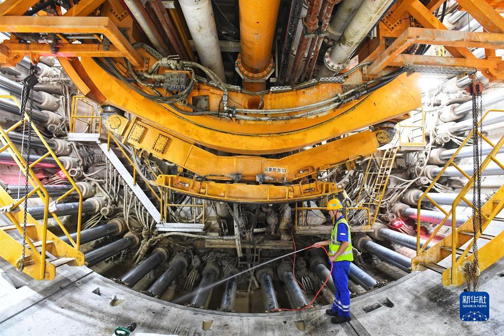 9月27日,施工人員在深江鐵路珠江口隧道清潔“大灣區號”盾構機。