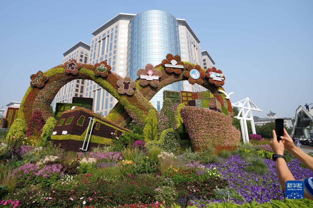 9月27日,市民在東單路口拍攝“開放發展”花壇。
