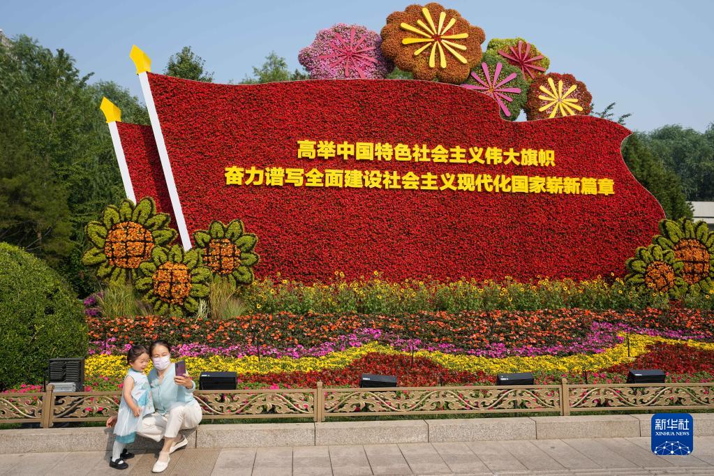9月27日,市民在建國門西北角的“偉大征程”花壇前留影。