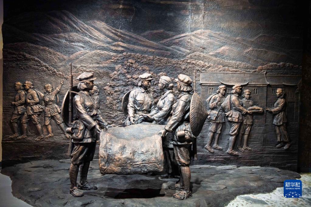 這是在湖南省郴州市汝城縣沙洲瑤族村“半條被子的溫暖”專題陳列館拍攝的“半條被子”故事場景雕塑(2020年9月17日攝)。新華社記者 陳思汗 攝