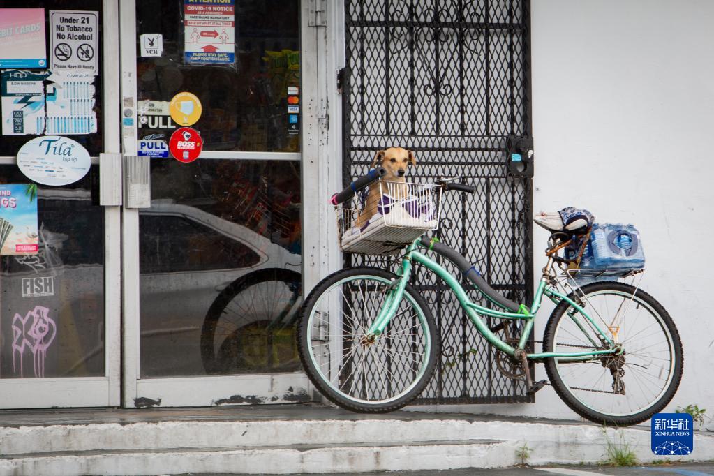 9月27日,在美國佛羅里達州邁阿密,一輛裝載著瓶裝水的自行車停在商店門前。