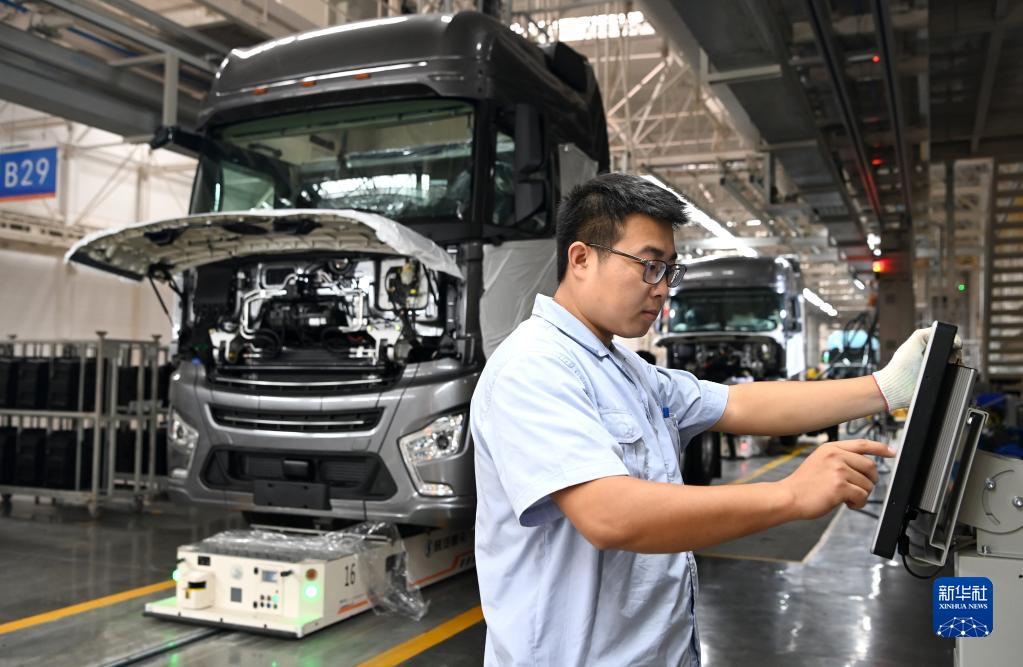 工作人員在陜汽重卡擴能項目汽車總裝生產線上作業(9月27日攝)。