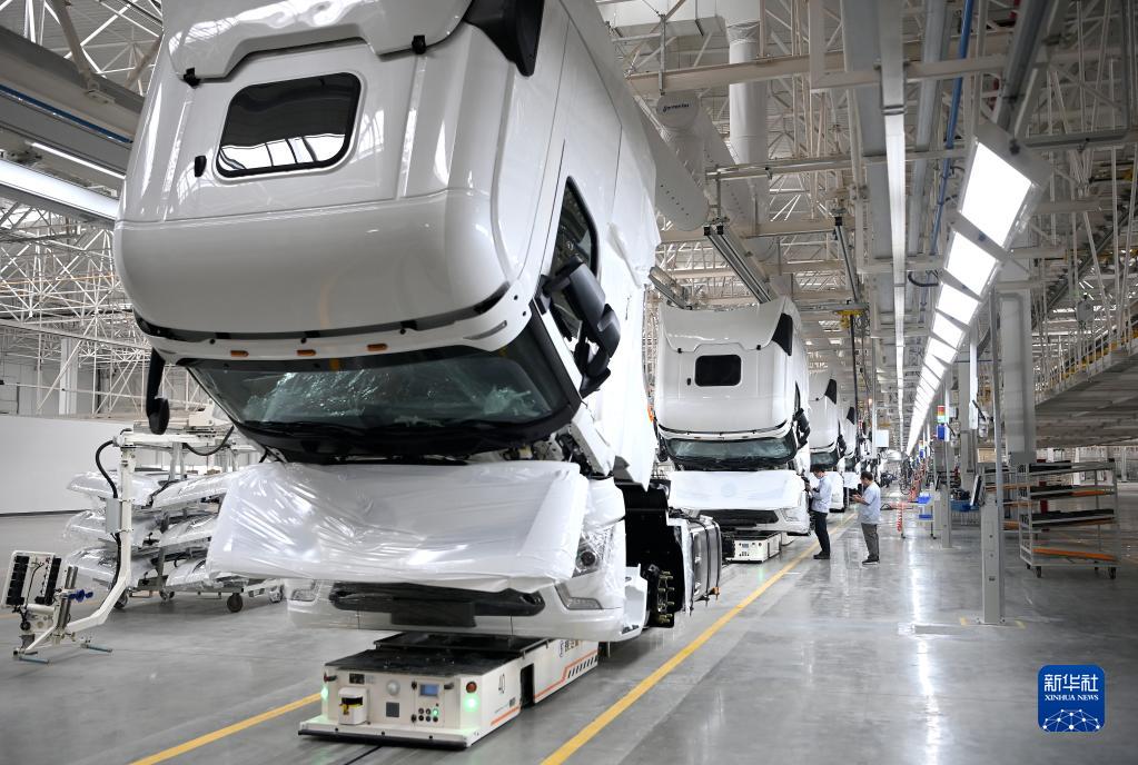 工作人員在陜汽重卡擴能項目汽車總裝生產線上作業(9月27日攝)。
