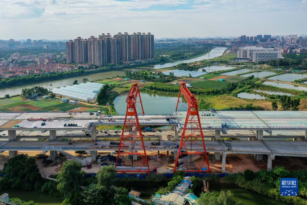 這是9月27日拍攝的莞番高速雙層橋架梁施工現場(無人機照片)。