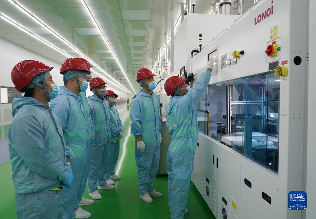 9月28日,工人在隆基綠能15GW高效單晶電池項目車間內進行學習培訓。