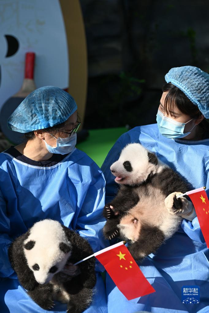 9月28日,成都大熊貓繁育研究基地工作人員抱著2022級新生大熊貓幼仔亮相太陽產房。