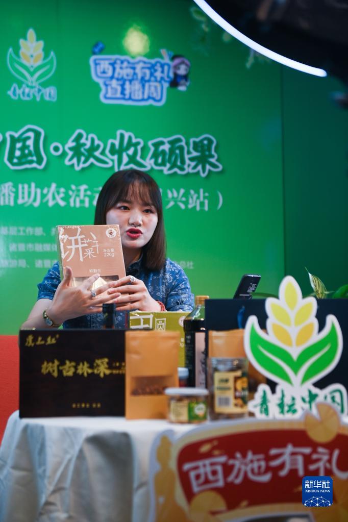 9月28日,在諸暨市共富直播周啟動儀式現場的直播間內,一名主播正在進行特色農產品直播。