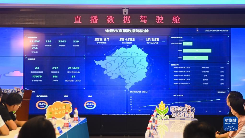 9月28日,諸暨市共富直播周啟動儀式現場的大屏幕上顯示共富直播周的觀看人數、銷售額、銷售種類等實時數據。