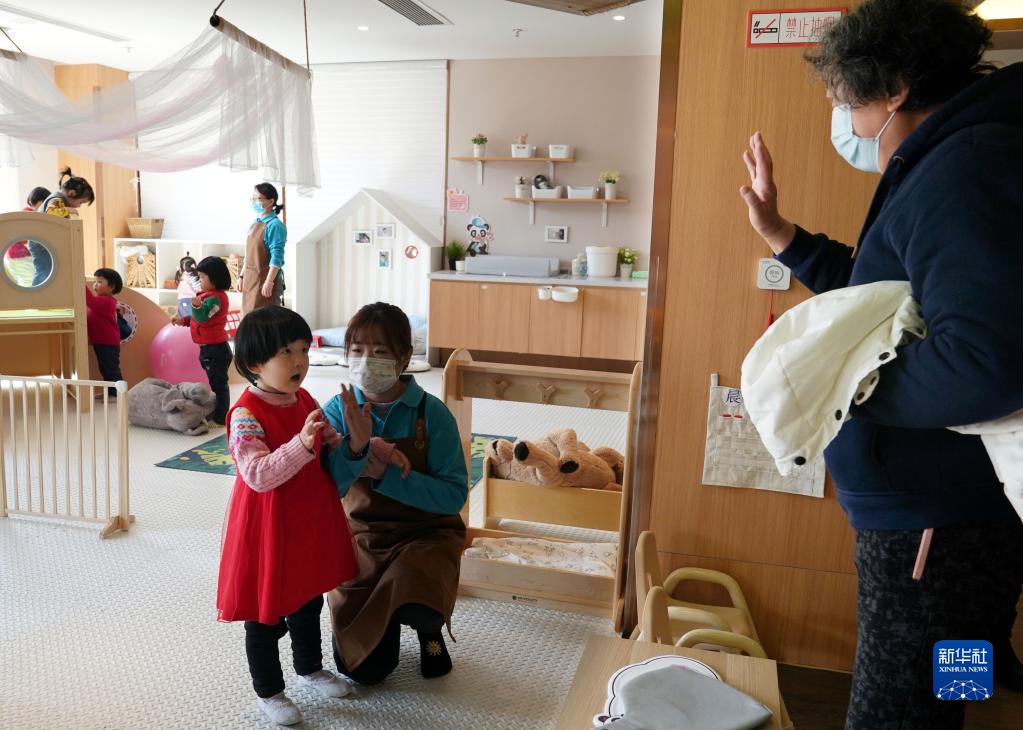 在江寧路街道社區綜合為老服務中心的“寶寶屋”,小朋友與外婆揮手說再見(2022年3月7日攝)。