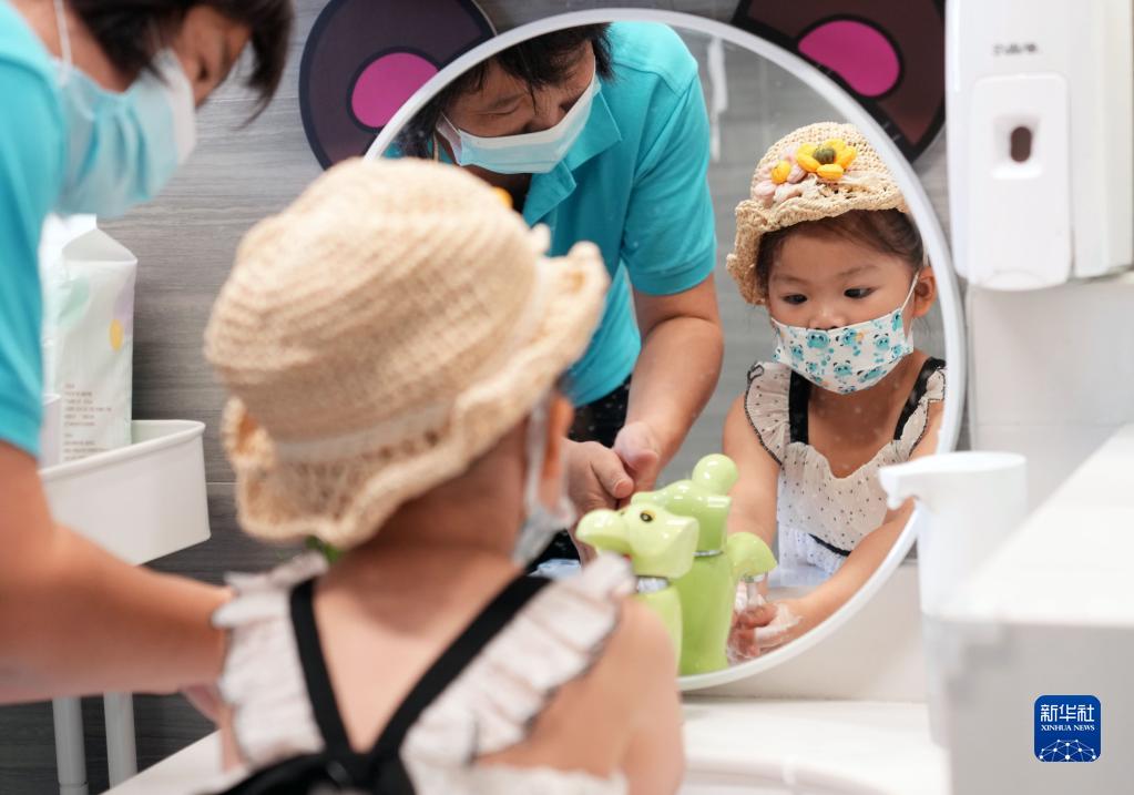 9月27日,在江寧路街道社區黨群服務中心內的“寶寶屋”,看護人員在指導小朋友洗手。