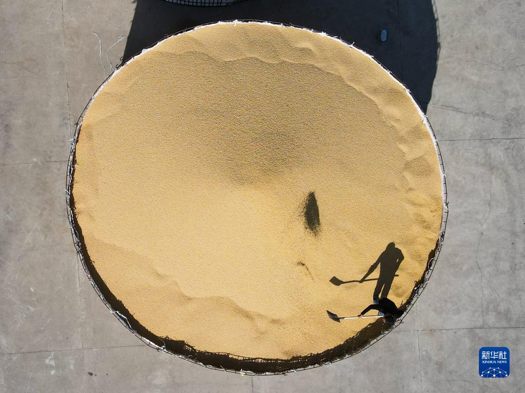 9月28日,在呼倫貝爾農墾綽爾河農牧場,工作人員在平整大豆(無人機照片)。