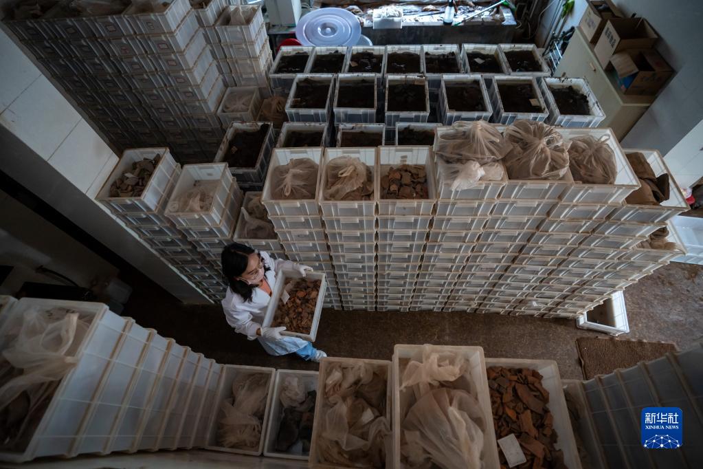 考古工作者在整理云南河泊所遺址出土的各類文化遺物(2022年9月21日攝)。
