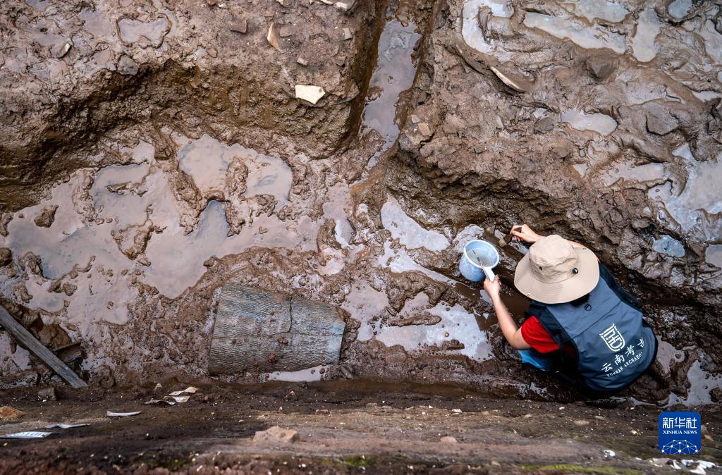 考古工作者在云南河泊所遺址現場進行清理發掘工作(2022年9月21日攝)。