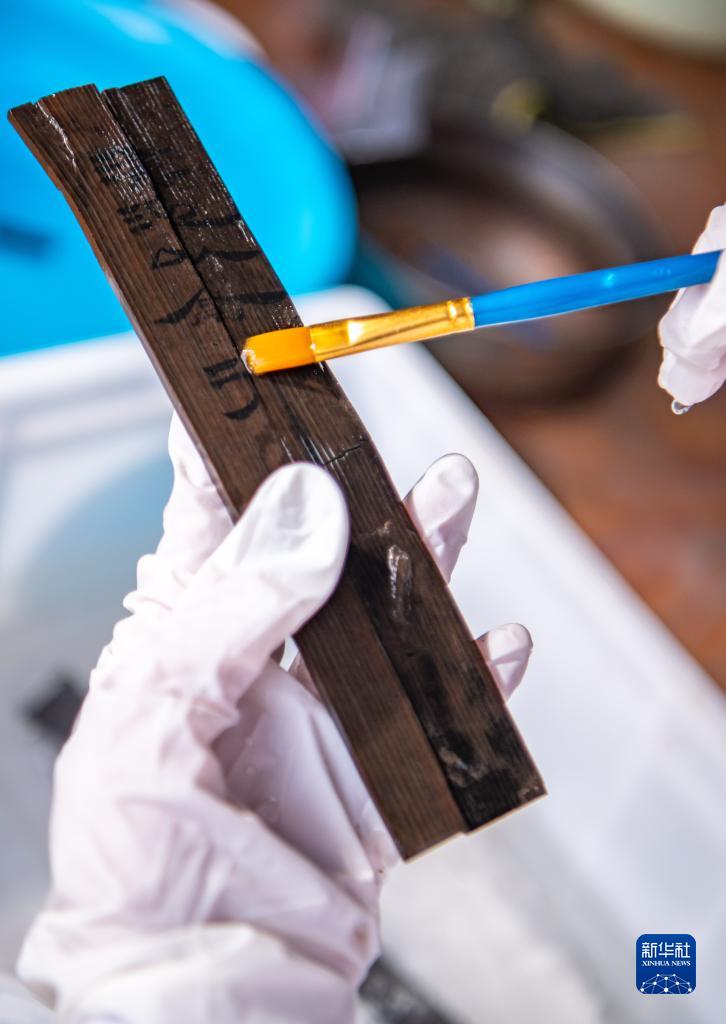 考古工作者在清理云南河泊所遺址出土的簡牘(2022年9月21日攝)。