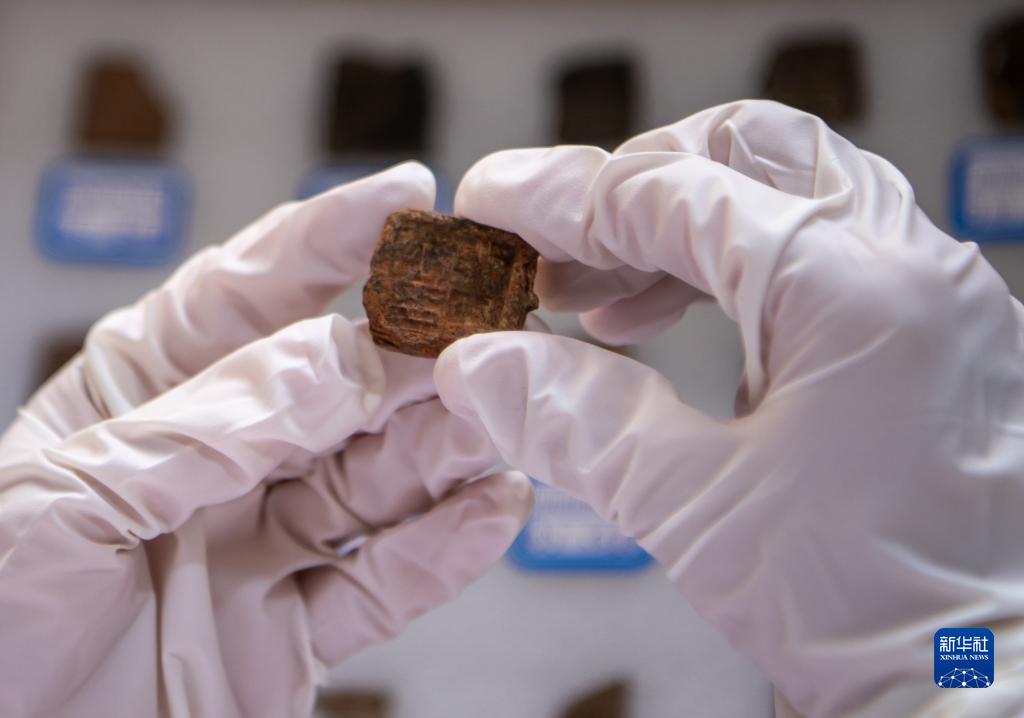 考古工作者在檢查云南河泊所遺址出土的封泥(2022年9月21日攝)。