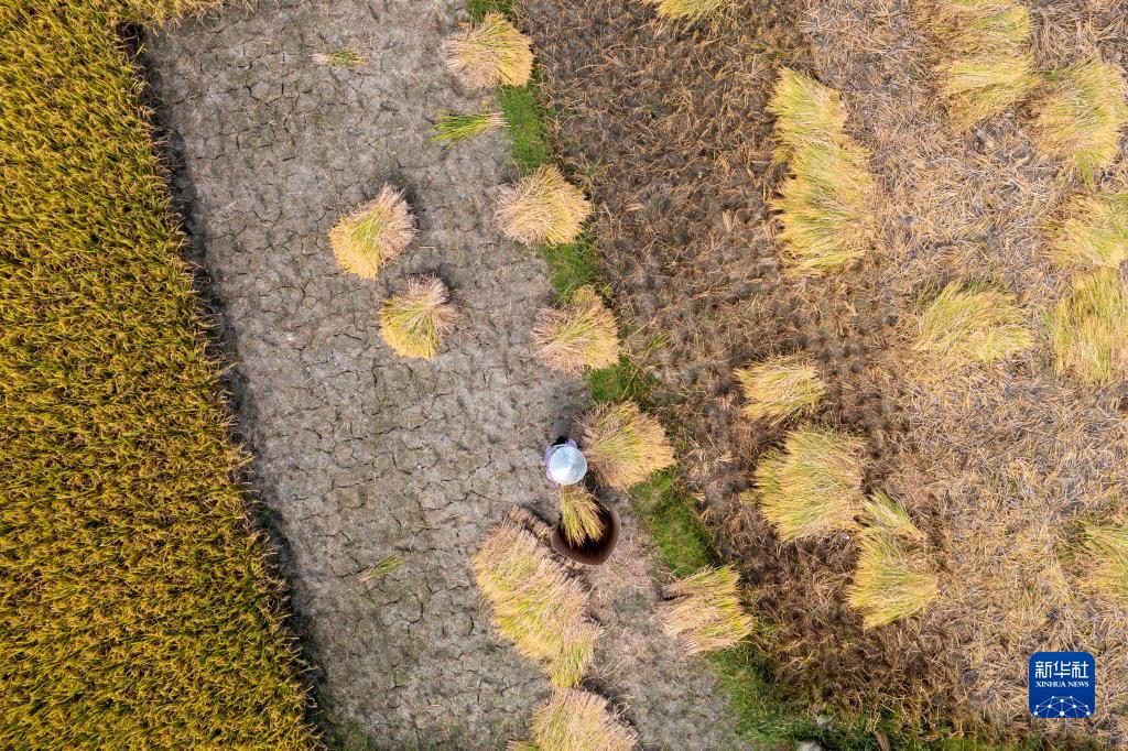 9月28日,福建省漳州市南靖縣書洋鎮曲江村村民在田間打稻谷(無人機照片)。