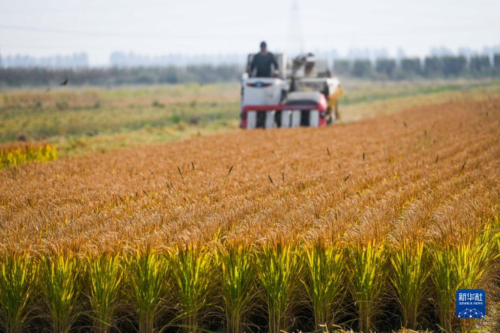 9月28日,河北省唐山市海港經濟開發區王灘鎮農民駕駛農機在稻田收割水稻。
