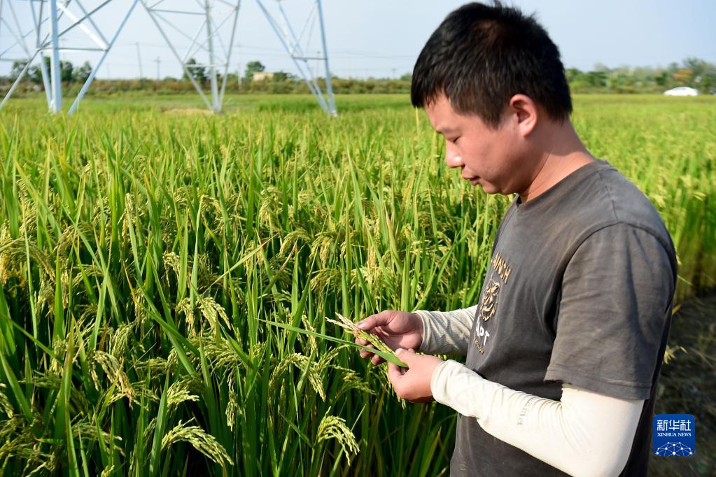9月26日,安徽省合肥市長豐縣崗集鎮牛寨村種糧大戶陳磊在查看節水抗旱稻的生長情況。