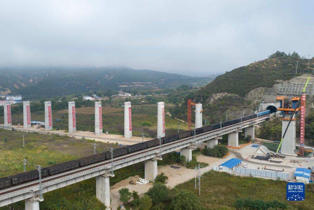 這是9月28日拍攝的位于陜西省延安市洛川縣的西延高鐵北洛河特大橋施工現場(無人機照片)。