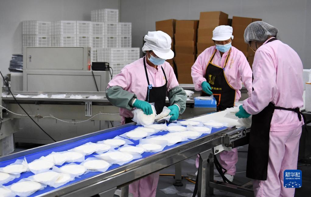 陜西省渭南市潼關縣盛潼餐飲管理有限公司的工作人員在生產加工車間分裝肉夾饃速凍餅(9月28日攝)。潼關肉夾饃是著名特色小吃,目前全縣10余家肉夾饃企業實現了自動化,全縣每天可生產230多萬個肉夾饃餅,銷往全國各地及海外地區。