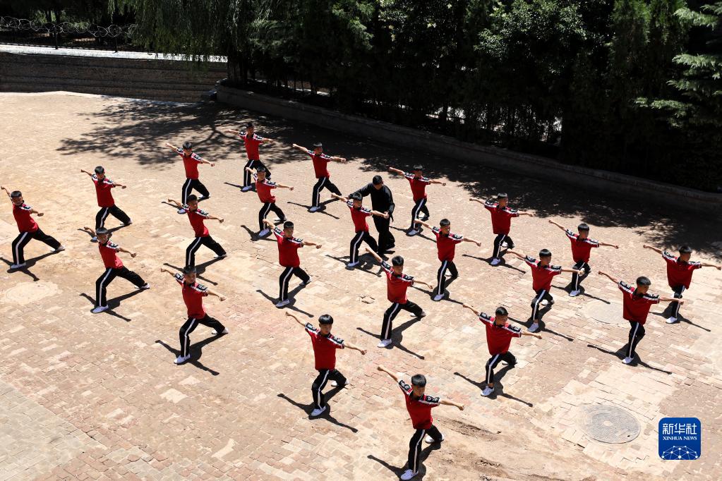 這是河南嵩山少林塔溝武校的學生在李迎港的指導下上課(2022年7月7日攝)。